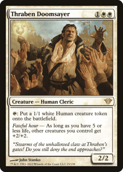 Create two 1/1 white Human creature tokens. Fateful hour — If you have 5 or less life, create five of those tokens instead.