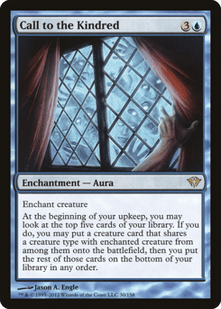 Enchant creature At the beginning of your upkeep, you may look at the top five cards of your library. If you do, you may put a creature card that shares a creature type with enchanted creature from among them onto the battlefield, then you put the rest of those cards on the bottom of your library in any order.