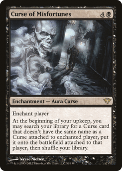 Enchant player At the beginning of your upkeep, you may search your library for a Curse card that doesn't have the same name as a Curse attached to enchanted player, put it onto the battlefield attached to that player, then shuffle.