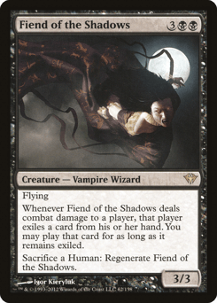 Flying Whenever this creature deals combat damage to a player, that player exiles a card from their hand. You may play that card for as long as it remains exiled. Sacrifice a Human: Regenerate this creature.