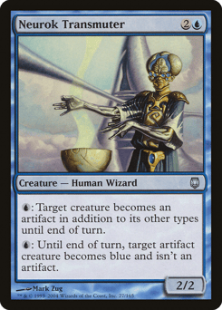 {U}: Target creature becomes an artifact in addition to its other types until end of turn. {U}: Until end of turn, target artifact creature becomes blue and isn't an artifact.