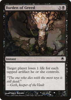 Target player loses 1 life for each tapped artifact they control.