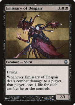 Flying Whenever this creature deals combat damage to a player, that player loses 1 life for each artifact they control.