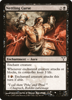 Enchant creature Whenever enchanted creature attacks or blocks, its controller loses 3 life. {1}{R}: Enchanted creature attacks this turn if able.