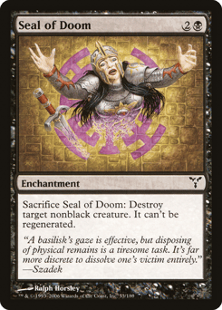 Sacrifice this enchantment: Destroy target nonblack creature. It can't be regenerated.