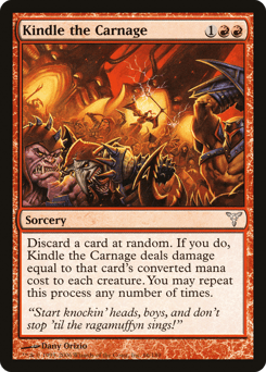 Discard a card at random. If you do, Kindle the Carnage deals damage equal to that card's mana value to each creature. You may repeat this process any number of times.