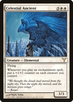 Flying Whenever you cast an enchantment spell, put a +1/+1 counter on each creature you control.