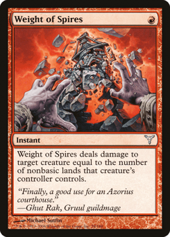 Weight of Spires deals damage to target creature equal to the number of nonbasic lands that creature's controller controls.