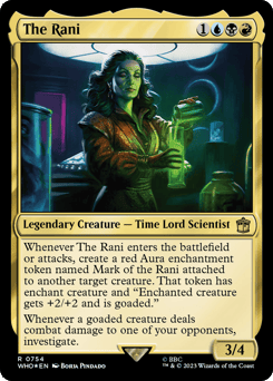Whenever The Rani enters or attacks, create a red Aura enchantment token named Mark of the Rani attached to another target creature. That token has enchant creature and "Enchanted creature gets +2/+2 and is goaded." Whenever a goaded creature deals combat damage to one of your opponents, investigate.