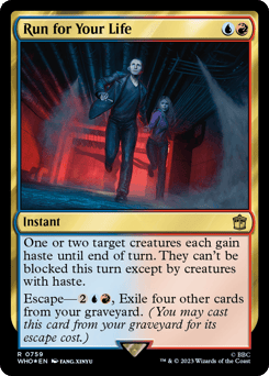 One or two target creatures each gain haste until end of turn. They can't be blocked this turn except by creatures with haste. Escape—{2}{U}{R}, Exile four other cards from your graveyard. (You may cast this card from your graveyard for its escape cost.)