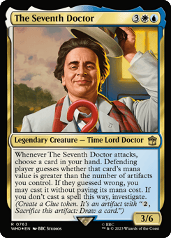 Whenever The Seventh Doctor attacks, choose a card in your hand. Defending player guesses whether that card's mana value is greater than the number of artifacts you control. If they guessed wrong, you may cast it without paying its mana cost. If you don't cast a spell this way, investigate. (Create a Clue token. It's an artifact with "{2}, Sacrifice this token: Draw a card.")