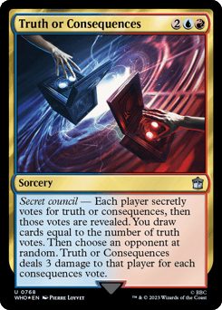 Secret council — Each player secretly votes for truth or consequences, then those votes are revealed. You draw cards equal to the number of truth votes. Then choose an opponent at random. Truth or Consequences deals 3 damage to that player for each consequences vote.