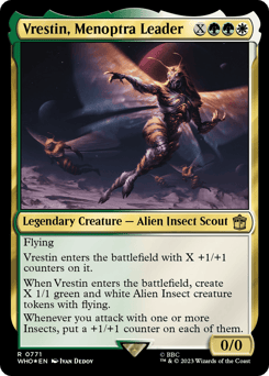 Flying Vrestin enters with X +1/+1 counters on it. When Vrestin enters, create X 1/1 green and white Alien Insect creature tokens with flying. Whenever you attack with one or more Insects, put a +1/+1 counter on each of them.