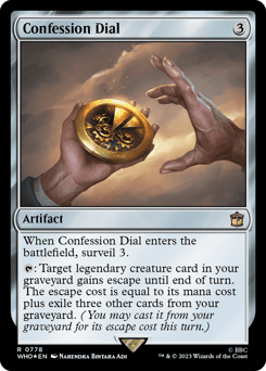 When this artifact enters, surveil 3. {T}: Target legendary creature card in your graveyard gains escape until end of turn. The escape cost is equal to its mana cost plus exile three other cards from your graveyard. (You may cast it from your graveyard for its escape cost this turn.)