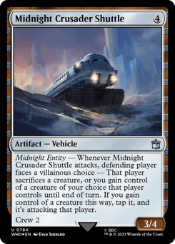 Midnight Entity — Whenever this Vehicle attacks, defending player faces a villainous choice — That player sacrifices a creature of their choice, or you gain control of a creature of your choice that player controls until end of turn. If you gain control of a creature this way, tap it, and it's attacking that player. Crew 2