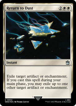 Exile target artifact or enchantment. If you cast this spell during your main phase, you may exile up to one other target artifact or enchantment.