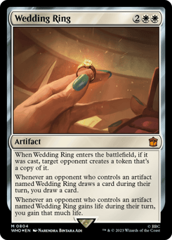 When this artifact enters, if it was cast, target opponent creates a token that's a copy of it. Whenever an opponent who controls an artifact named Wedding Ring draws a card during their turn, you draw a card. Whenever an opponent who controls an artifact named Wedding Ring gains life during their turn, you gain that much life.