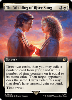 Meet in Reverse — You draw cards from the bottom of your library rather than the top. Spoilers — Whenever an opponent scries, surveils, or searches their library, put a +1/+1 counter on River Song. Then River Song deals damage to that player equal to its power.