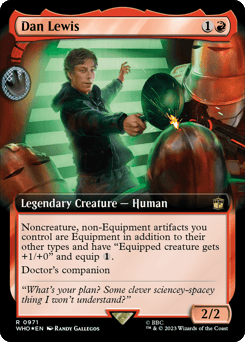 Equipped creature gets +3/+0. As long as equipped creature is attacking, it has first strike and must be blocked by a Dalek if able. Equip legendary creature {1} Equip {3}