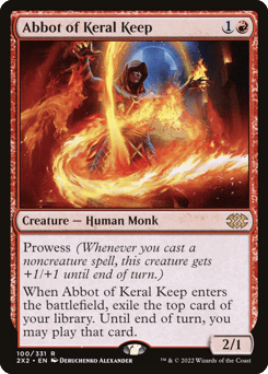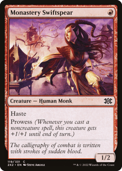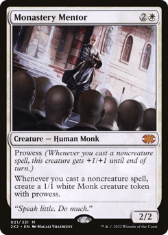 Prowess (Whenever you cast a noncreature spell, this creature gets +1/+1 until end of turn.) Whenever you cast a noncreature spell, create a 1/1 white Monk creature token with prowess.