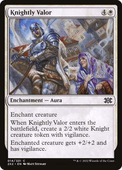 Enchant creature When this Aura enters, create a 2/2 white Knight creature token with vigilance. (Attacking doesn't cause it to tap.) Enchanted creature gets +2/+2 and has vigilance.