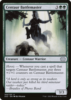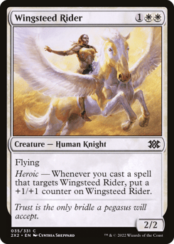 Flying Heroic — Whenever you cast a spell that targets this creature, put a +1/+1 counter on this creature.