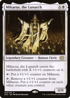 Mikaeus enters with X +1/+1 counters on it. {T}: Put a +1/+1 counter on Mikaeus. {T}, Remove a +1/+1 counter from Mikaeus: Put a +1/+1 counter on each other creature you control.