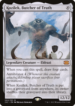 When you cast this spell, draw four cards. Annihilator 4 (Whenever this creature attacks, defending player sacrifices four permanents of their choice.) When Kozilek is put into a graveyard from anywhere, its owner shuffles their graveyard into their library.