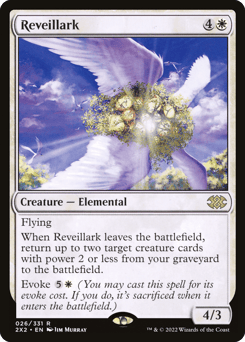 Flying When this creature leaves the battlefield, return up to two target creature cards with power 2 or less from your graveyard to the battlefield. Evoke {5}{W} (You may cast this spell for its evoke cost. If you do, it's sacrificed when it enters.)