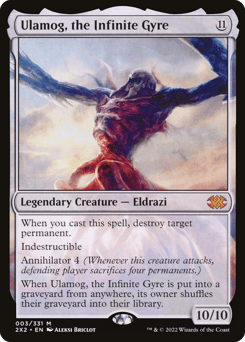 When you cast this spell, destroy target permanent. Indestructible Annihilator 4 (Whenever this creature attacks, defending player sacrifices four permanents of their choice.) When Ulamog is put into a graveyard from anywhere, its owner shuffles their graveyard into their library.