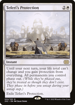 Until your next turn, your life total can't change and you gain protection from everything. All permanents you control phase out. (While they're phased out, they're treated as though they don't exist. They phase in before you untap during your untap step.) Exile Teferi's Protection.