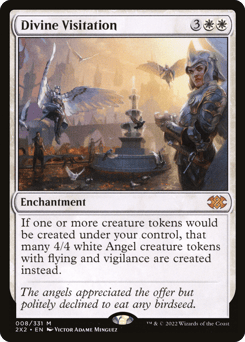 If one or more creature tokens would be created under your control, that many 4/4 white Angel creature tokens with flying and vigilance are created instead.