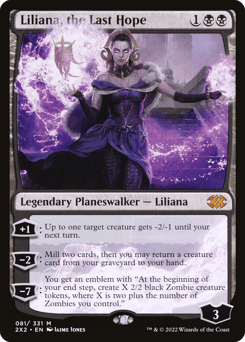 [+1]: Up to one target creature gets -2/-1 until your next turn. [−2]: Mill two cards, then you may return a creature card from your graveyard to your hand. [−7]: You get an emblem with "At the beginning of your end step, create X 2/2 black Zombie creature tokens, where X is two plus the number of Zombies you control."