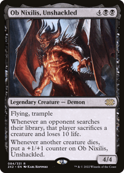 Flying, trample Whenever an opponent searches their library, that player sacrifices a creature of their choice and loses 10 life. Whenever another creature dies, put a +1/+1 counter on Ob Nixilis.
