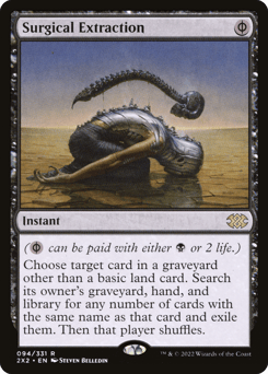 ({B/P} can be paid with either {B} or 2 life.) Choose target card in a graveyard other than a basic land card. Search its owner's graveyard, hand, and library for any number of cards with the same name as that card and exile them. Then that player shuffles.