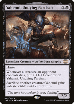 Haste Whenever a creature an opponent controls dies, put a +1/+1 counter on Yahenni. Sacrifice another creature: Yahenni gains indestructible until end of turn.