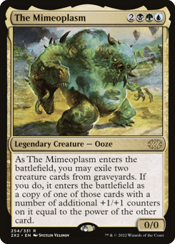 As The Mimeoplasm enters, you may exile two creature cards from graveyards. If you do, it enters as a copy of one of those cards with a number of additional +1/+1 counters on it equal to the power of the other card.