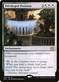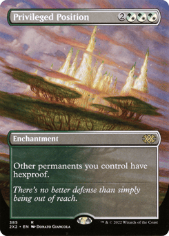 ({G/W} can be paid with either {G} or {W}.) Other permanents you control have hexproof. (They can't be the targets of spells or abilities your opponents control.)