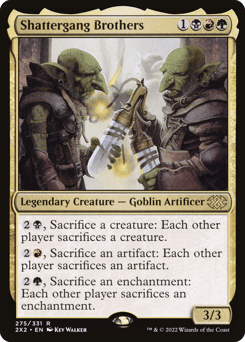 {2}{B}, Sacrifice a creature: Each other player sacrifices a creature. {2}{R}, Sacrifice an artifact: Each other player sacrifices an artifact. {2}{G}, Sacrifice an enchantment: Each other player sacrifices an enchantment.