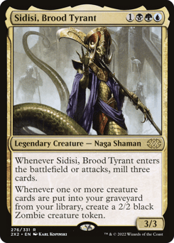 Whenever Sidisi enters or attacks, mill three cards. Whenever one or more creature cards are put into your graveyard from your library, create a 2/2 black Zombie creature token.