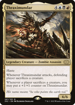 Haste Whenever Thraximundar attacks, defending player sacrifices a creature of their choice. Whenever a player sacrifices a creature, you may put a +1/+1 counter on Thraximundar.