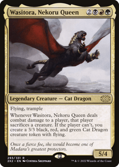 Flying, trample Whenever Wasitora deals combat damage to a player, that player sacrifices a creature of their choice. If the player can't, you create a 3/3 black, red, and green Cat Dragon creature token with flying.