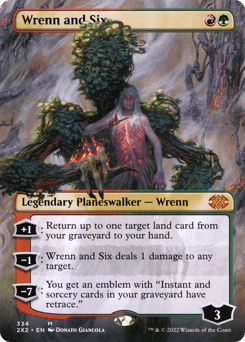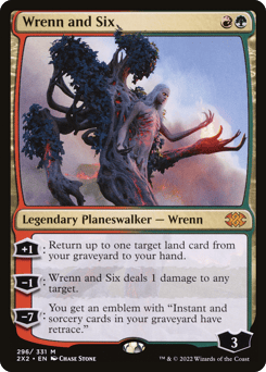 [+1]: Return up to one target land card from your graveyard to your hand. [−1]: Wrenn and Six deals 1 damage to any target. [−7]: You get an emblem with "Instant and sorcery cards in your graveyard have retrace." (You may cast instant and sorcery cards from your graveyard by discarding a land card in addition to paying their other costs.)