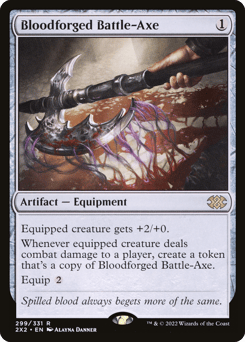 Equipped creature gets +2/+0. Whenever equipped creature deals combat damage to a player, create a token that's a copy of this Equipment. Equip {2}