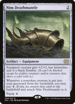 Equipped creature gets +2/+2, has intimidate, and is a black Zombie. (A creature with intimidate can't be blocked except by artifact creatures and/or creatures that share a color with it.) Whenever a nontoken creature is put into your graveyard from the battlefield, you may pay {4}. If you do, return that card to the battlefield and attach this Equipment to it. Equip {4}