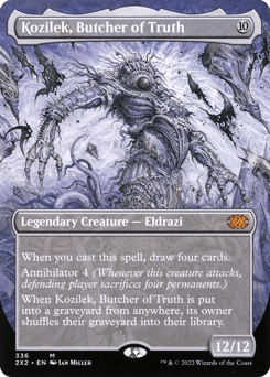 When you cast this spell, draw four cards. Annihilator 4 (Whenever this creature attacks, defending player sacrifices four permanents of their choice.) When Kozilek is put into a graveyard from anywhere, its owner shuffles their graveyard into their library.