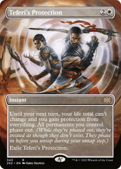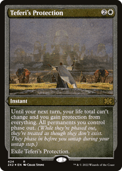 Until your next turn, your life total can't change and you gain protection from everything. All permanents you control phase out. (While they're phased out, they're treated as though they don't exist. They phase in before you untap during your untap step.) Exile Teferi's Protection.
