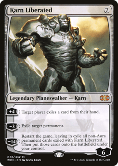 [+4]: Target player exiles a card from their hand. [−3]: Exile target permanent. [−14]: Restart the game, leaving in exile all non-Aura permanent cards exiled with Karn. Then put those cards onto the battlefield under your control.