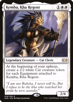 At the beginning of your upkeep, create a 2/2 white Cat creature token for each Equipment attached to Kemba.