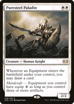 Whenever an Equipment you control enters, you may draw a card. Metalcraft — Equipment you control have equip {0} as long as you control three or more artifacts.